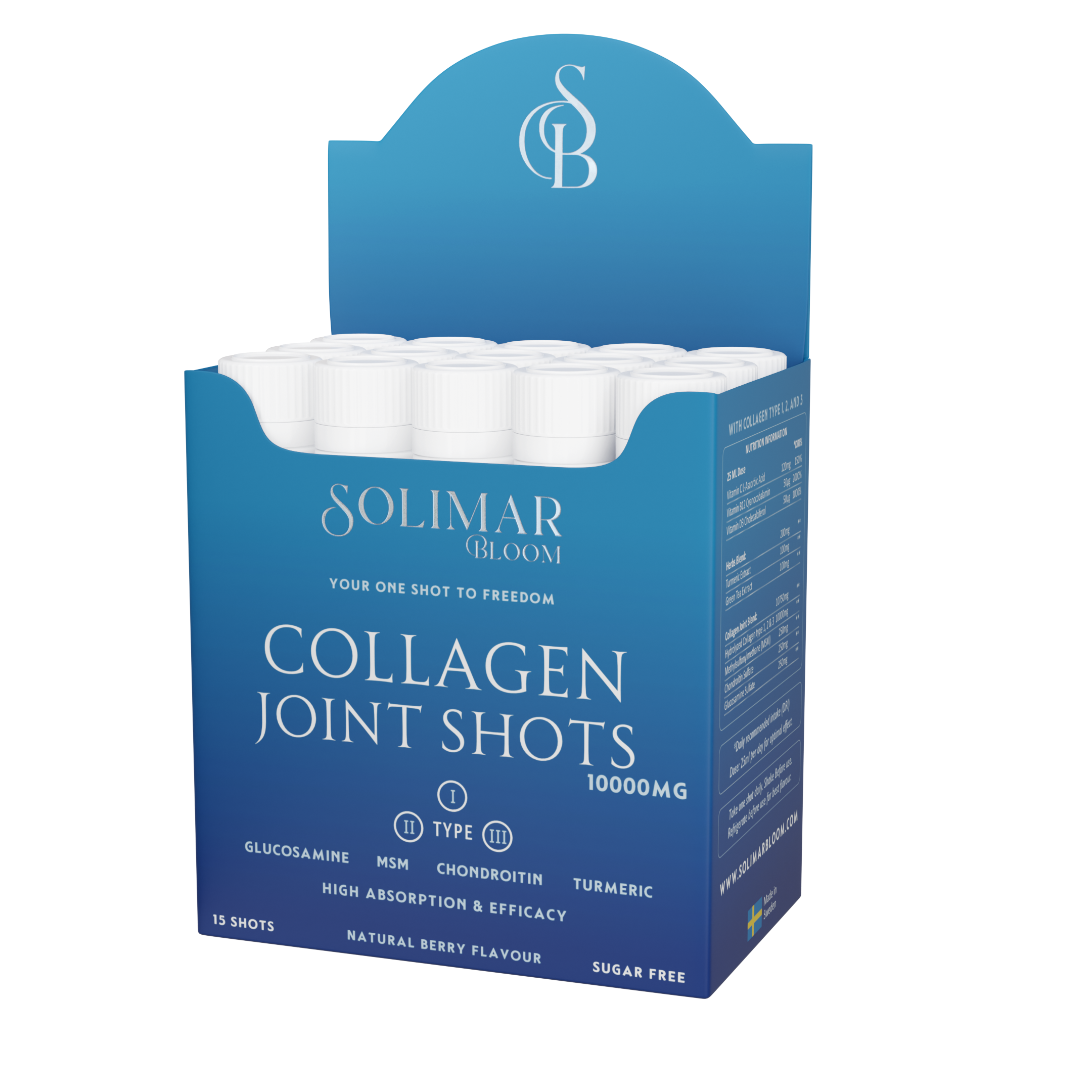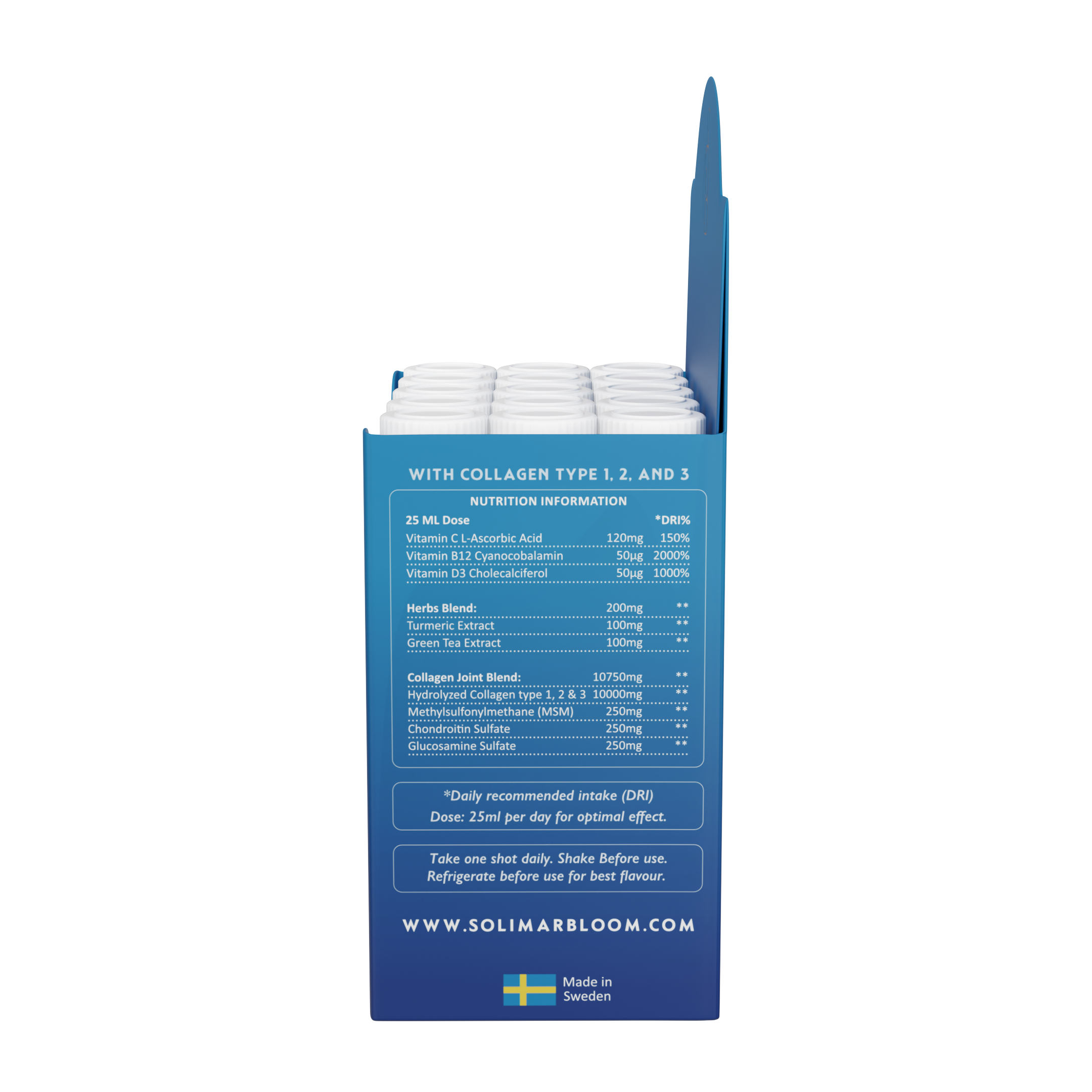 Solimar Bloom’s Collagen 10000 is designed to Ease Joint Pain and contribute to cartilage repair. The convenient 25 ml vial makes it easy to take the daily dose. One shot contains 25 ml of top-rated hydrolyzed collagen type II, enriched with Vitamins, Herbs, and our Collagen Joint Blend.