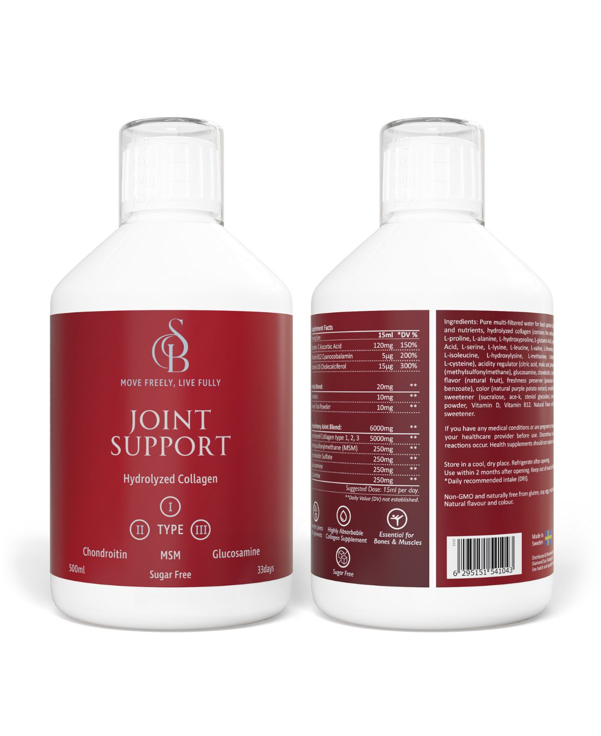 A Joint Support Multivitamin Liquid is designed to address the nutritional needs of joints, cartilage, connective tissues, mobility, flexibility, and overall bone health combining vitamins, minerals, and bioactive compounds by delivering key nutrients in a fast-absorbing and acting liquid form. It helps reduce pain, improve mobility, slow age or activity-related joint degeneration discomfort, supports cartilage health, and enhances overall movement.