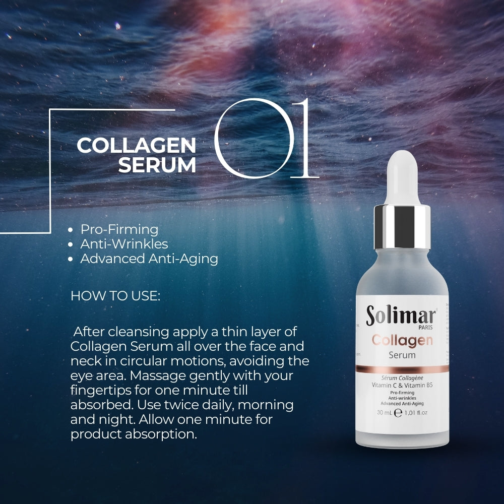Step 1: Solimar Paris Collagen Serum: After cleansing apply a thin layer of Collagen Serum all over the face and neck in circular motions, avoiding the eye area. Massage gently with your fingertips for one minute till absorbed. Use twice daily, morning and night. Allow one minute for product absorption.